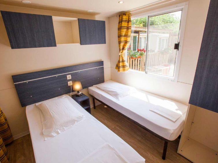 "Prestige", 3-kamers mobilhome. Doelmatig ingericht: woon-/eetkamer met eettafel. Uitgang naar het terras. 1 kamer met 1 2-pers bed (140 cm). 1 kamer met 2 bedden (70 cm). Kookhoek (4 kookpitten (vlammen), diepvriezer). Douche/WC. Air-conditioning, heteluchtverwarming. Terras overdekt. Terrasmeubelen. Ter beschikking: Internet (Internet (WiFi), extra). Parkeerplaats (1 Auto). Niet rokers woning. Maximaal 2 kleine huisdieren/honden toegestaan. IT023022B1P4KHX4L9